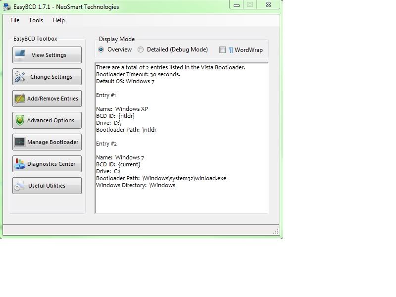 | 871676 | 2010-04-01 11:10:00 | There is an extra entry in there .... I tried using the CMD and following a website just now but the same thing. Then saw anythere site (severforums) that said boot into Windows XP and run Easy BCD inside XP, get it to rebuild the boot.ini and then add the Windows 7 bootmgr but still the same problem My EasyBCD setup is exactly like yours, except for the order of the OSes: i46.photobucket.com Maybe try re-arranging the order of the OSes in your setup; don't know if that'll help. |