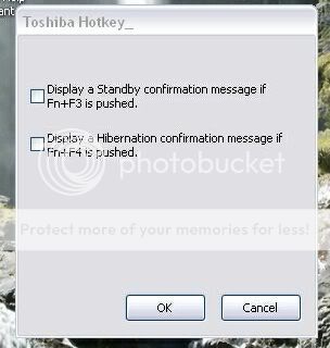 | 768974 | 2009-04-27 11:11:00 | Hey guys, on mum's Toshiba laptop its got this window that pops up everytime the computer starts up. Its called Toshiba Hotkey and its got a couple of tick boxes in it, but no matter what you tick or dont tick, it comes up every time and she's getting really annoyed with it, as it never used to show up. this is it: i362.photobucket.com anybody have any ideas on how to stop it from popping up? thanks heaps |