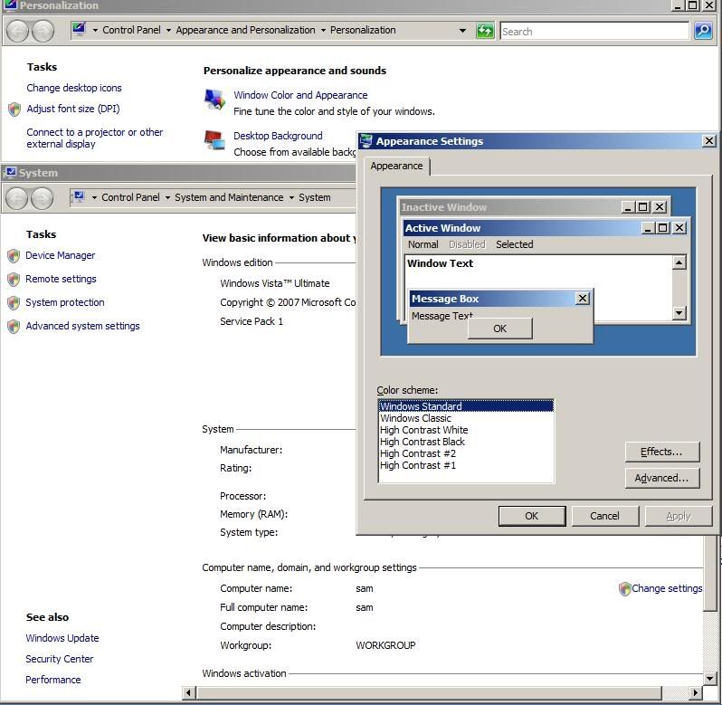 | 721064 | 2008-11-18 03:24:00 | I have dissabled some functions so now I can only use windows standard/classic, and neither of the Windows Vista options in "Windows Colour and Appearance" Any clues on how to bring it back? |