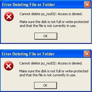| 667577 | 2008-05-09 06:28:00 | Shut down NOD first. It wasn't open in the first place. Then use Hijackthis misc tools Delete on Reboot for those persistent files. I did that Then go through the registry and delete all NOD references there too. how do i do that? search for everything nod32 and delete? when i ran hijack this, nothing with nod32 had shown in the log file but it is still on the computer |