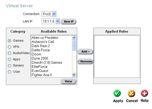 | 587036 | 2007-09-02 02:44:00 | I just got my new modem, the Gen II d-link G604t, and in the 10.1.1.1 I can't see an option for port forwarding. I know how to port forward, on the first gen G604t it was a piece of cake, as it had an option for port forwarding and was pretty straight forward. This one though.... Anyone have this modem/know how to do it? |