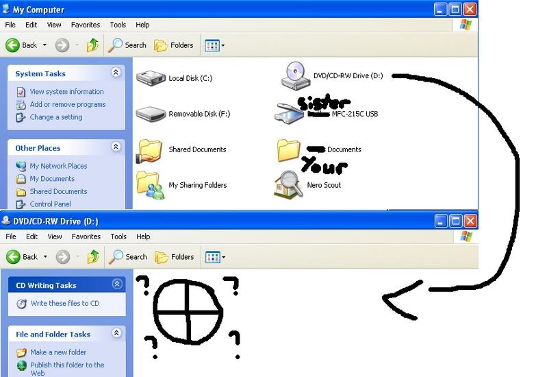 | 581924 | 2007-08-17 06:12:00 | Probably could've been said in a few words, but I felt like drawing a crosshair. img.photobucket.com I'll mess around in Nero and try and burn it again. EDIT: And Speedy, I used DVD Data Disc, I think I finalized it? I know it said burn successful after like 10 - 20 mins tho. File is a folder with pretty much every file you can think of in it (Well, not really) but music files, pics, word docs, vids, etc. EDIT2: Went into ISO1_DVD.nri on the desktop (mustve made it while burning) and it's now "writing to disc", this time it's a different looking screen so maybe I needed to do this afterwards, which its doing now? |
