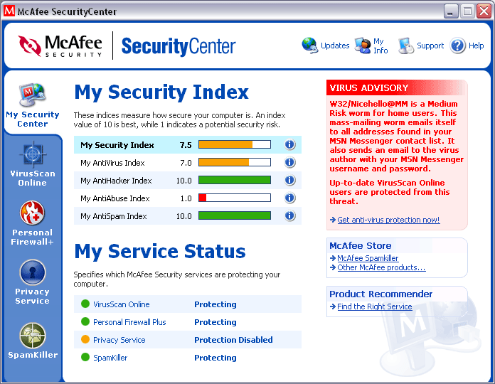 | 464420 | 2006-06-21 08:13:00 | It is just a Security Centre nothing to do with firewall unless you install Internet Secuirty Suite which contains firewall. My McAfee security has only virus program protection which supposed to be on at all time when running the computer. Well, if this (images.mcafee.com) is what you have it says personal firewall +. So, it does have a firewall. And it doesnt look like it says Internet security suite. |